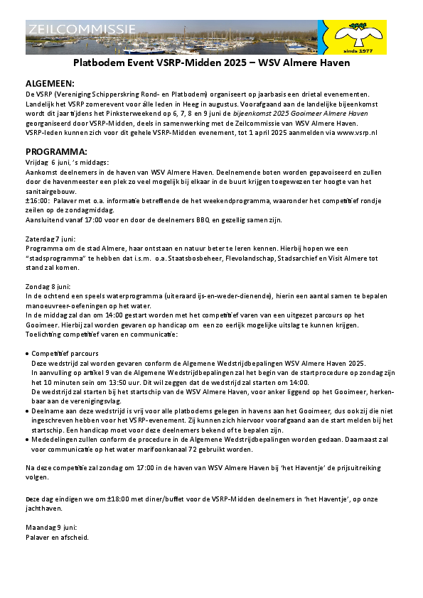 Van 6 t/m 9 juni organiseert VSRP-Midden een fantastisch Pinksterevent op het Gooimeer bij WSV Almere Haven! Vier dagen vol zeilen, ontdekken en gezellig samenzijn met andere platbodem liefhebbers. Dit doen we in samenwerking met de Zeilcommissie en Havenmeesters van de WSV Almere Haven.